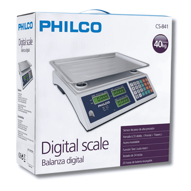 La balanza digital Philco CS-841 está diseñada para satisfacer las necesidades de comerciantes y emprendedores que requieren mediciones precisas y confiables. Su construcción en acero inoxidable garantiza una larga vida útil y resistencia al desgaste, mientras que las pantallas LCD dobles permiten una visualización clara del peso desde ambos lados.