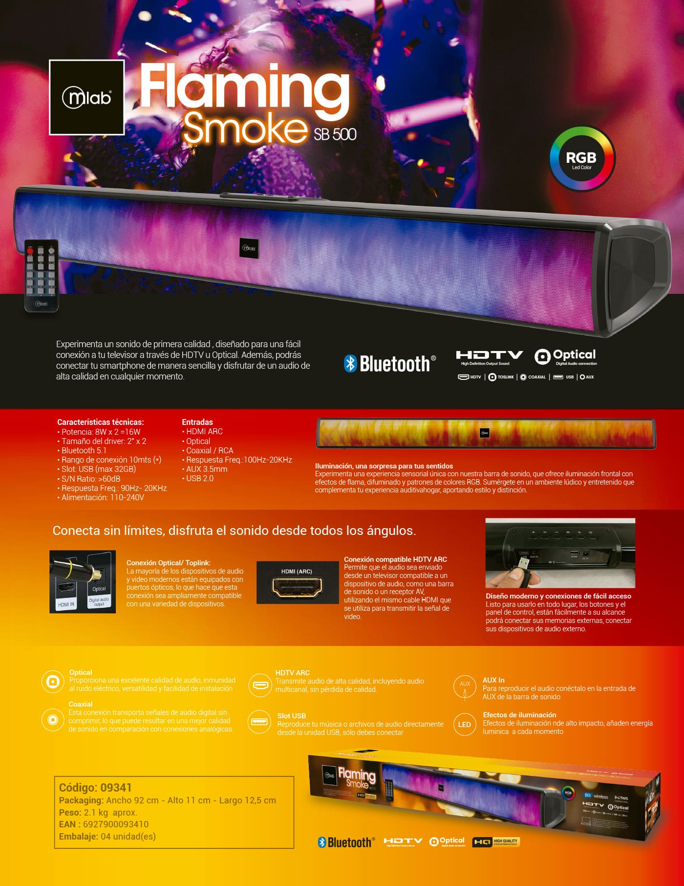 Iluminación, una sorpresa para tus sentidos: Experimenta una experiencia sensorial única con nuestra barra de sonido, que ofrece iluminación frontal con efectos de flama, difuminado y patrones de colores RGB. Sumérgete en un ambiente lúdico y entretenido que complementa tu experiencia auditiva, aportando estilo y distinción.