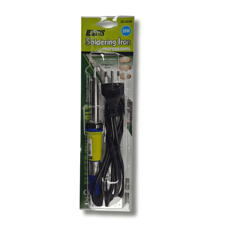 Cautín eléctrico de 30 watts, diseñado para trabajos de soldadura en electrónica y reparaciones eléctricas. Proporciona una rápida elevación de temperatura y mantiene un calor constante que permite realizar uniones firmes y precisas. Incorpora base metálica de apoyo para mayor seguridad durante su uso y almacenamiento.