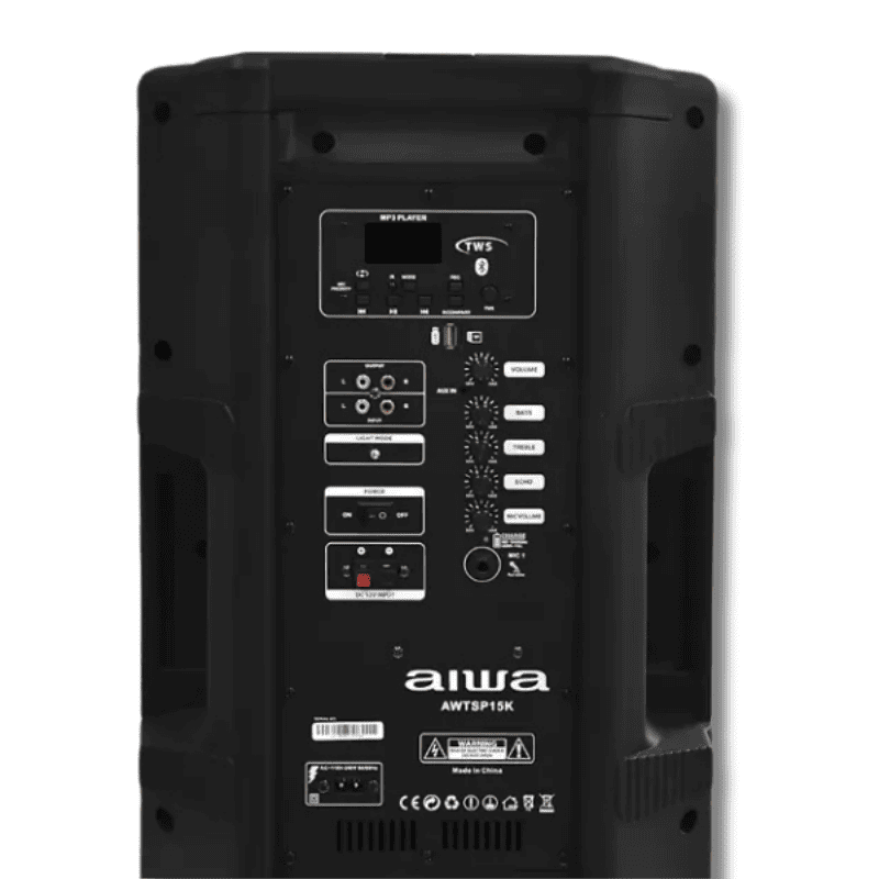 El Aiwa AW-TSP15K es un parlante portátil diseñado para karaoke y eventos multimedia, que combina potencia, versatilidad y conectividad. Cuenta con un woofer de 15 pulgadas y una potencia máxima anunciada de 1000W, ofreciendo un sonido potente y claro. Su sistema TWS permite conectar dos unidades de forma inalámbrica para una experiencia estéreo envolvente. Además, incluye múltiples opciones de entrada y accesorios que facilitan su uso en diferentes ambientes.