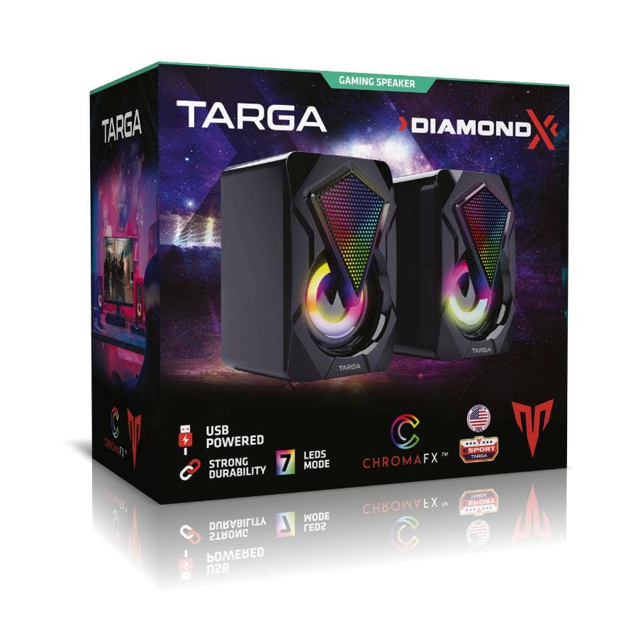 Los Diamond X de Targa son unos parlantes gamer para PC con conectividad Jack 3,5mm que te entregarán un poderoso sonido envolvente, natural, con claridad y precisión ideal para videojuegos. Diseñados en USA, los Diamond X son parlantes que entregan una potencia de 2x4w, luces led (Chroma FX) con 7 modos de luz. Además, cuenta con regularizador de volumen su cable mide 1.3 mts.