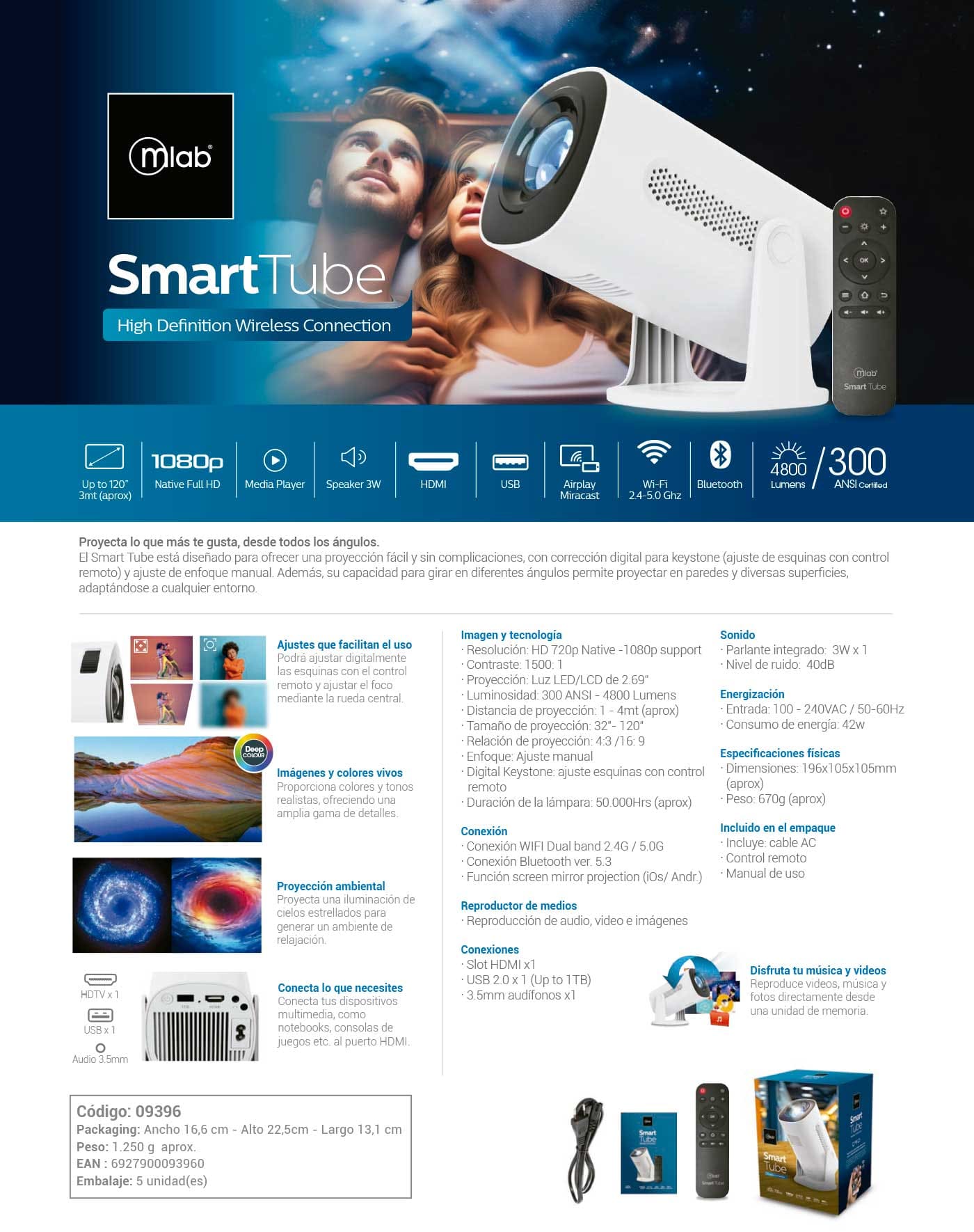 El Smart Tube está diseñado para ofrecer una proyección fácil y sin complicaciones, con corrección digital para keystone (ajuste de esquinas con control remoto) y ajuste de enfoque manual. Además, su capacidad para girar en diferentes ángulos permite proyectar en paredes y diversas superficies, adaptándose a cualquier entorno.
