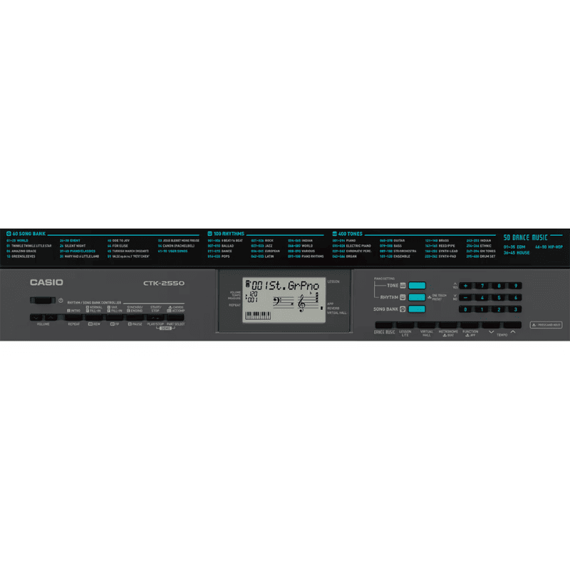 • 48 notas de polifonía (Cantidad de notas que pueden sonar a la vez. Esto incluye los acompañamientos que también consumen notas. De forma que si tocas encima de un acompañamiento se van acumulando más notas)