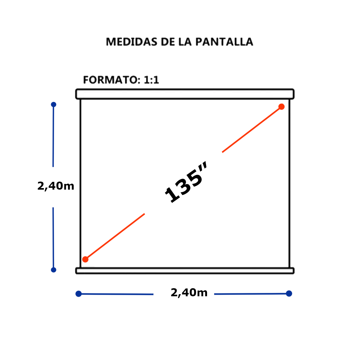 • El área de proyección de esta pantalla de 135” es: 2,40 X 2,40m.